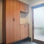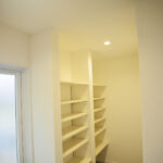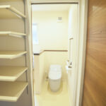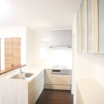 カップボードの裏側には勝手口につながるパントリーを設けたので冷蔵庫・ゴミペールを収納でき、使用頻度の少ないキッチン用品も片付けられるようになり奥様に喜んでいただきました。