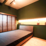 ダーク系のアクセントクロスと間接照明の組み合わせにより、