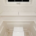 写真奥にはたっぷりとした収納スペースもあり、普段は戸を閉めお掃除道具などをスッキリと収納できてトイレ全体の雰囲気を壊しません。