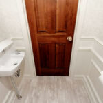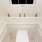 こだわりのペンダントライトと洋風の腰壁、またペーパーホルダーなどのディティールに至るまで、まるでパリのアパルトマンのような佇まいに。お家全体を同じ仕様にするのは大変ですが、トイレのような小さなスペースでもお気に入りの空間ができると毎日豊かな気持ちで過ごせそうです。