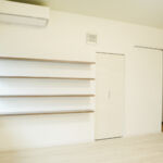テレビ下方の棚の間にはコンセントを、また壁面裏側の上部にルーターを設置することにより、使い勝手も良く収納棚としての機能を備えています。