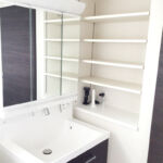 洗面脇にはたっぷりモノが置ける造作の可動棚を取り付けました。
