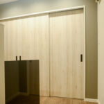 今回は、扉にではなく壁に取り付けることになりましたが、壁の裏側には収納部分があるため、ネコちゃんが通りにくいという難点がありました。そこで収納内部に仕切りを作ることで通りやすさを実現しました。