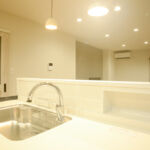 キッチンパネル部分のニッチ(写真中央)は普段お使いの洗剤の高さに合わせ設置しました。ぴったりサイズで片付けも楽しくなります。