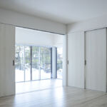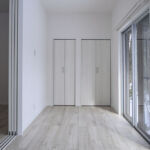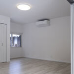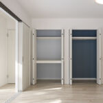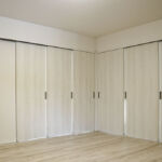 床は明るいホワイト系木目、収納の折れ戸もホワイト系ですっきり明るく統一しました。