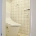 玄関扉は既存のものですが、写真手前のトイレ扉と同系色に仕上げて統一感を演出しました。また、郵便物の床落ち防止のために新たにレターボックスを設置しました。