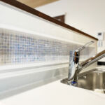 落ち着いた色味のシステムキッチンにモザイクタイル調のキッチンニッチを設置し、おしゃれかつ使いやすい仕様に。