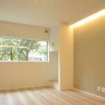 アッシュグレージュの床に石目調のアクセントクロス。グレイッシュなお色味でまとめ優しく上品な洋室へ。