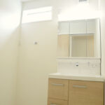 手洗いカウンター埋め込み収納はもちろん、手洗い部分はやや広めのつくりでハンドソープなどの置き場所も確保。手すりがあることで将来的な備えになり安心ですね!