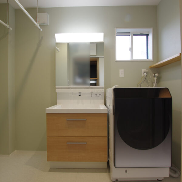 木目調の洗面台とグリーングレーの壁が優しい印象を演出。室内干し対応のランドリースペースも備え、家事効率もアップしました。