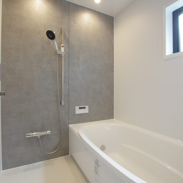 グレーのアクセントパネルが空間を引き締め、上質で落ち着いた印象に。清掃性と快適性も兼ね備えた浴室へと生まれ変わりました。
