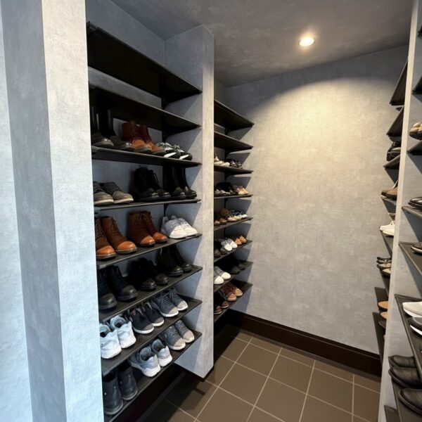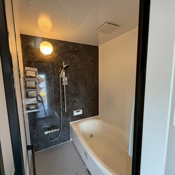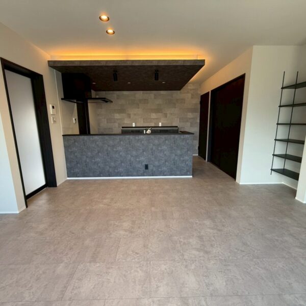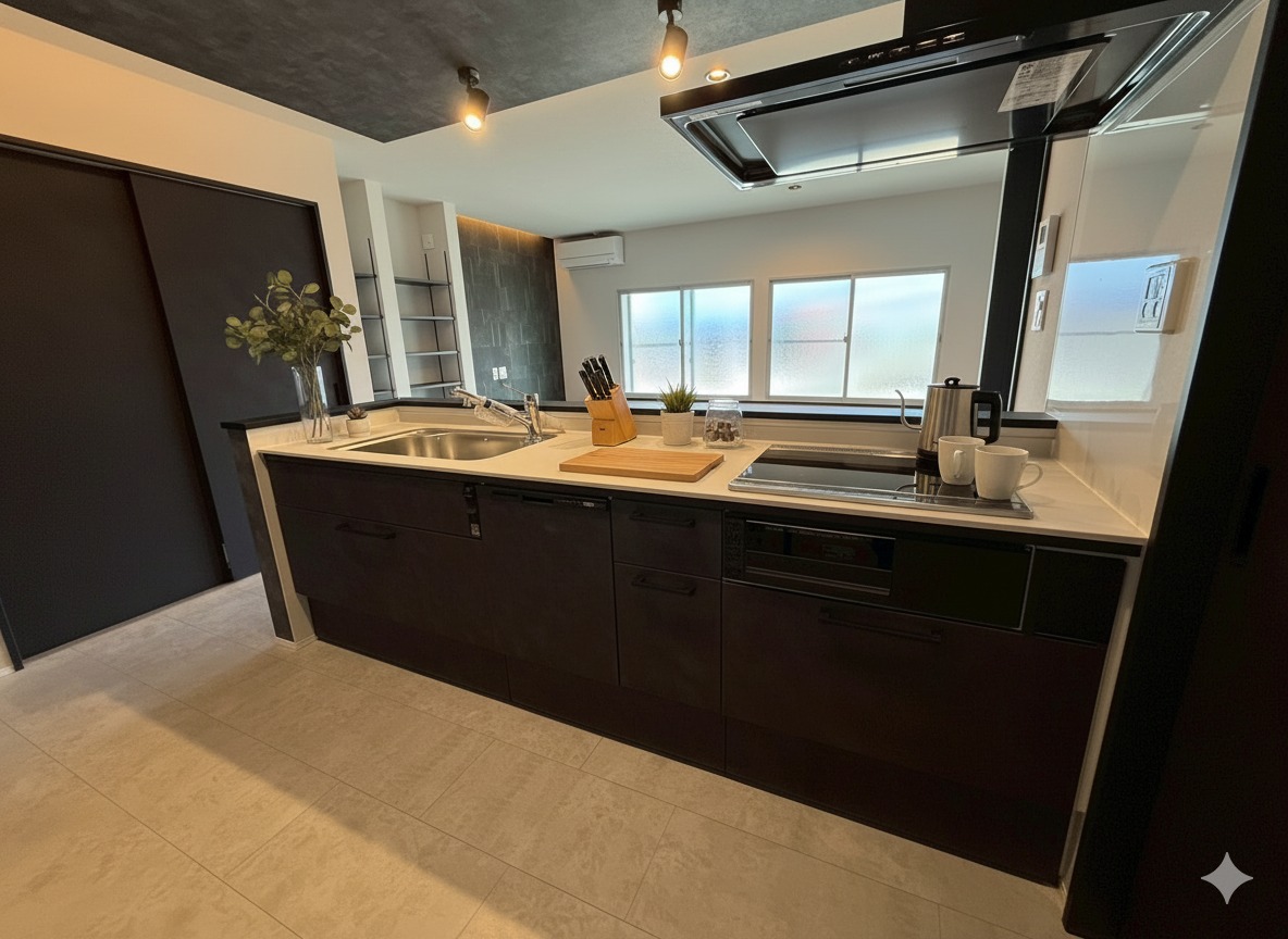 ダークカラーを基調に、素材感のあるタイルや造作棚を組み合わせることで、シックで洗練された空間に仕上がりました。
