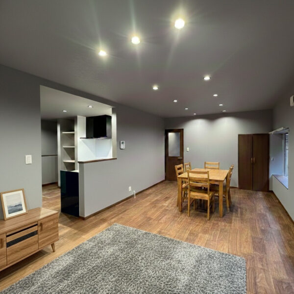 壁・天井をグレートーンでまとめ、木の質感を引き立てた住まい。