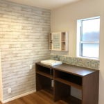 ご主人ご要望の幅広い造作飾り棚に加えて、アイアン金具の飾り棚・照明・建具がアクセントになっています。