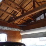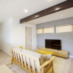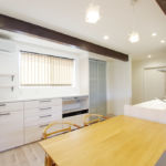 ワントーンのLDKでも、車庫で使われていた梁を活用した見せ梁がいいアクセントとなり印象が引き締まります。