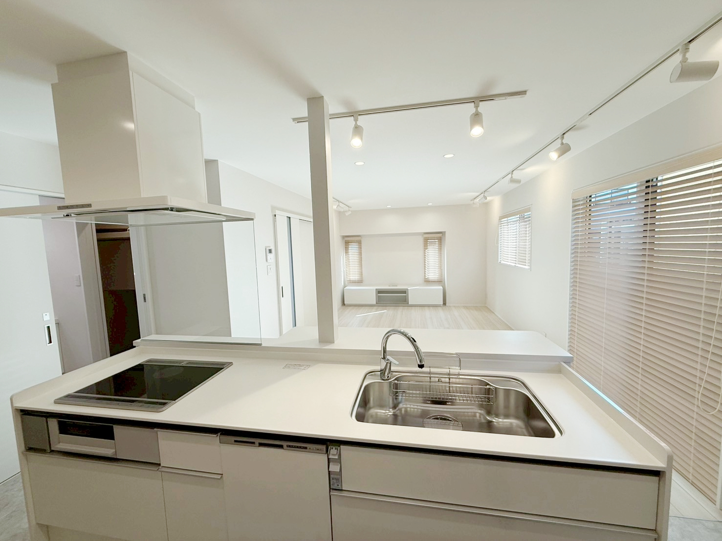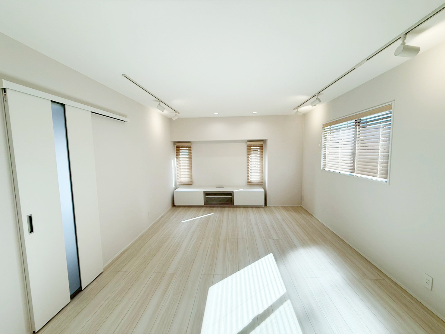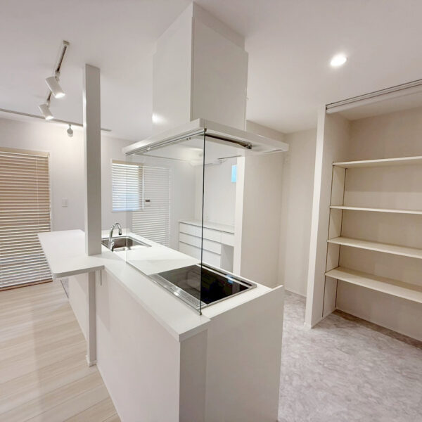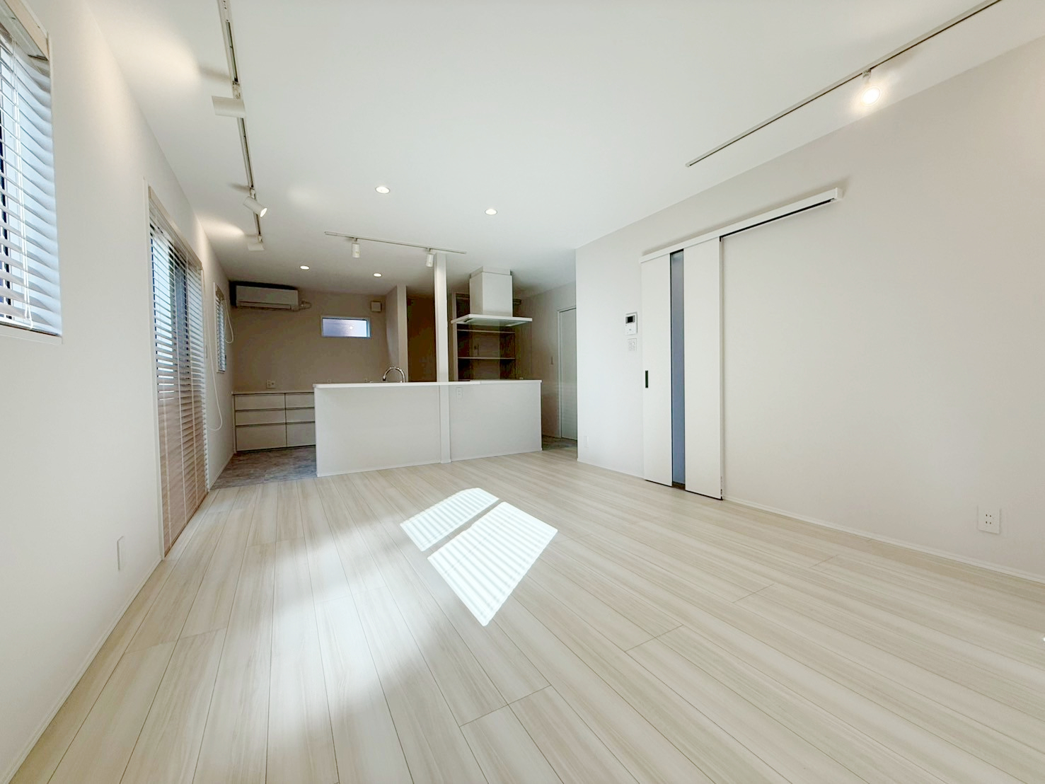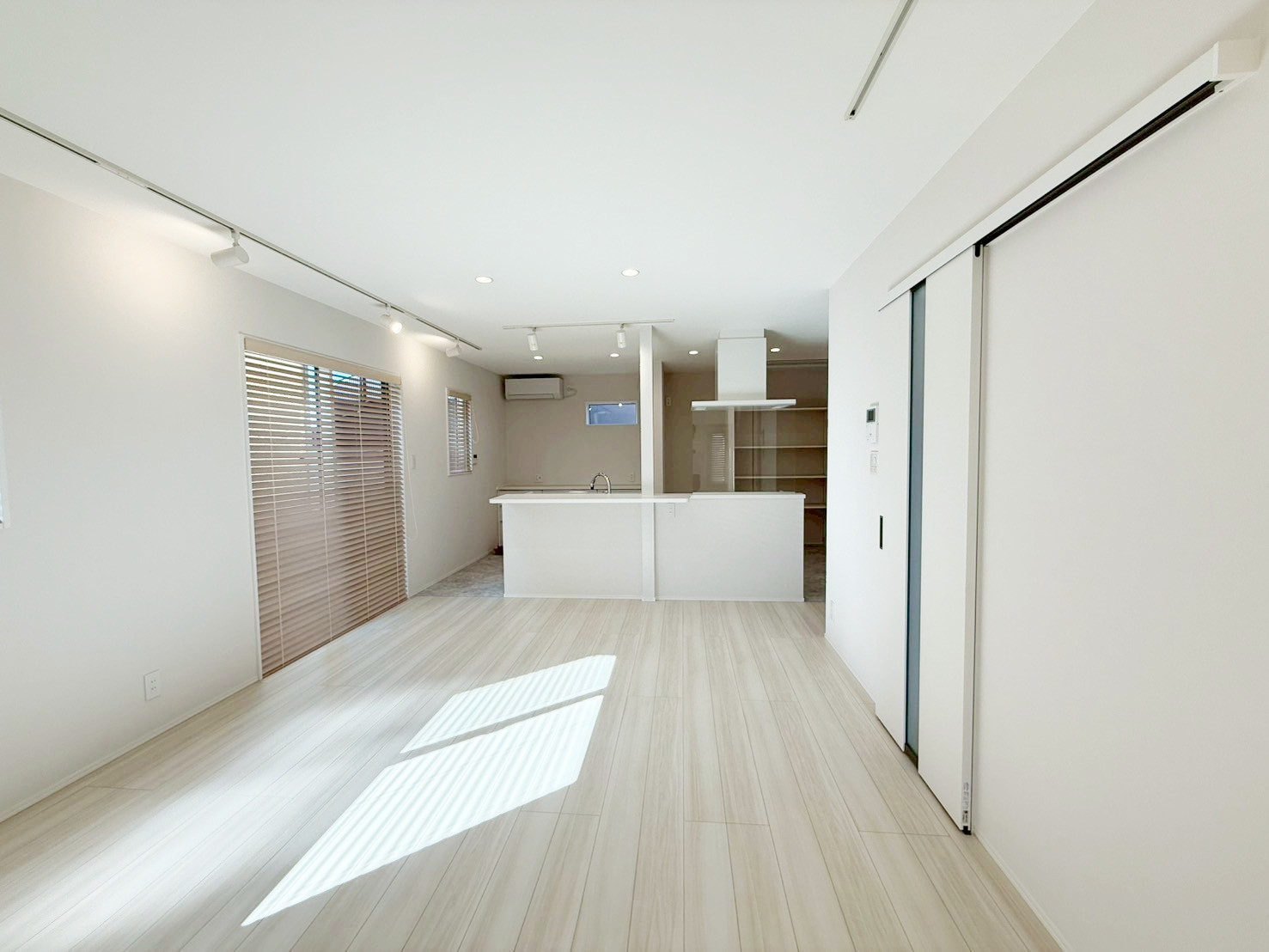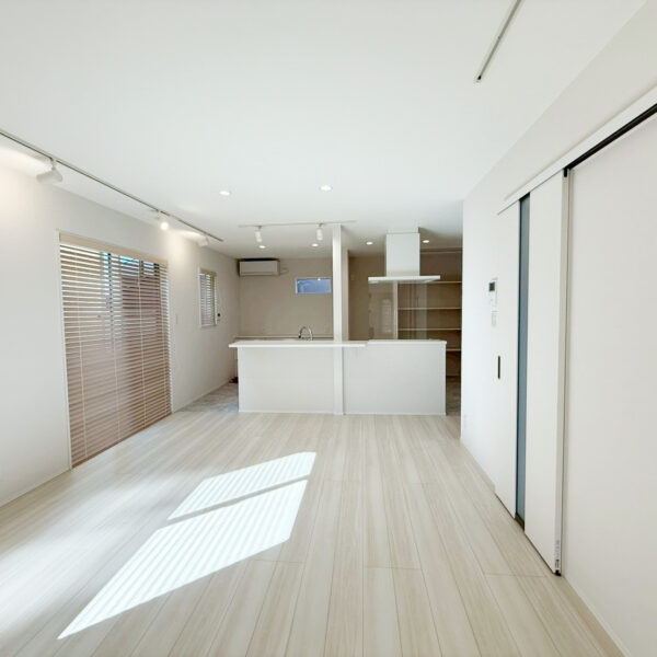 ・壁・天井・建具を白で統一し、床には明るい木目を採用。空間全体を広く、明るく見せています。