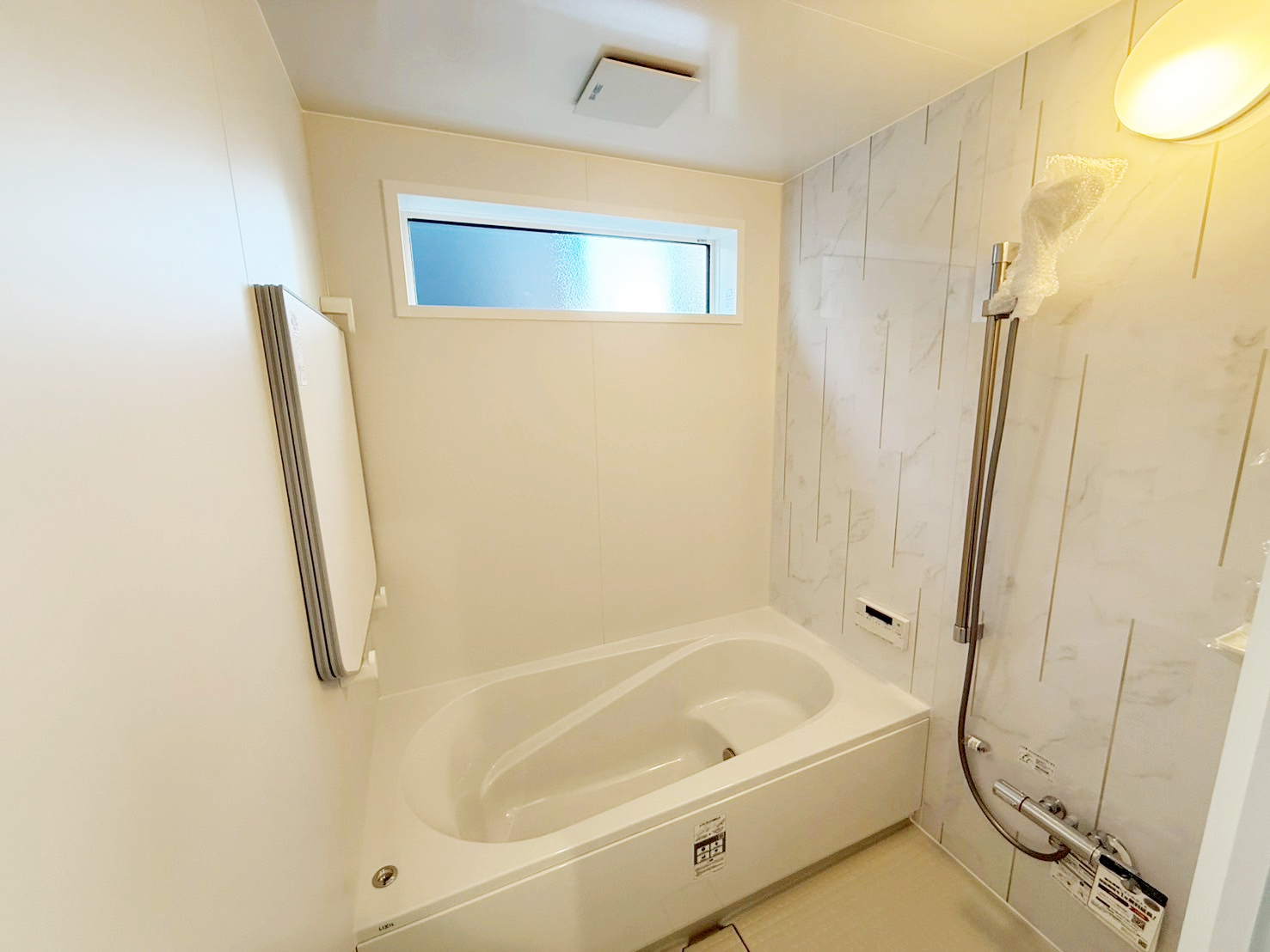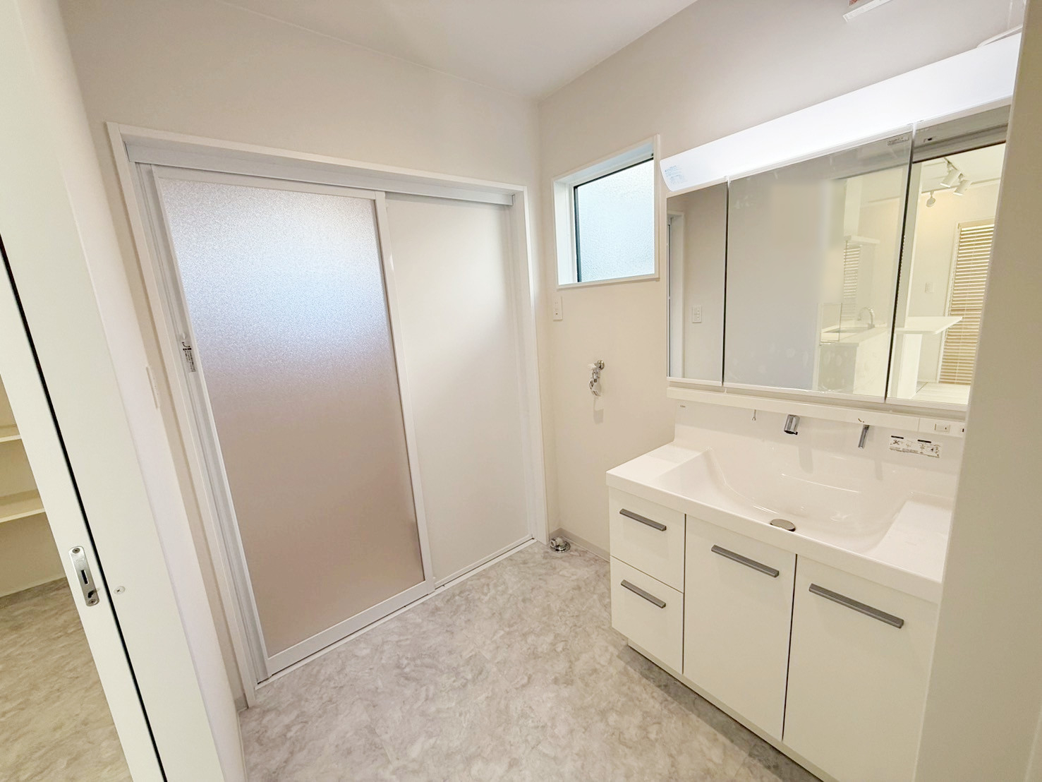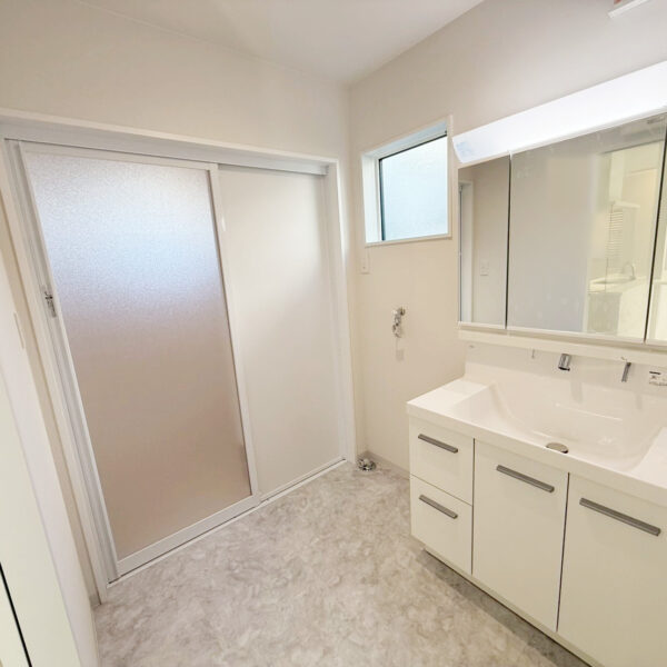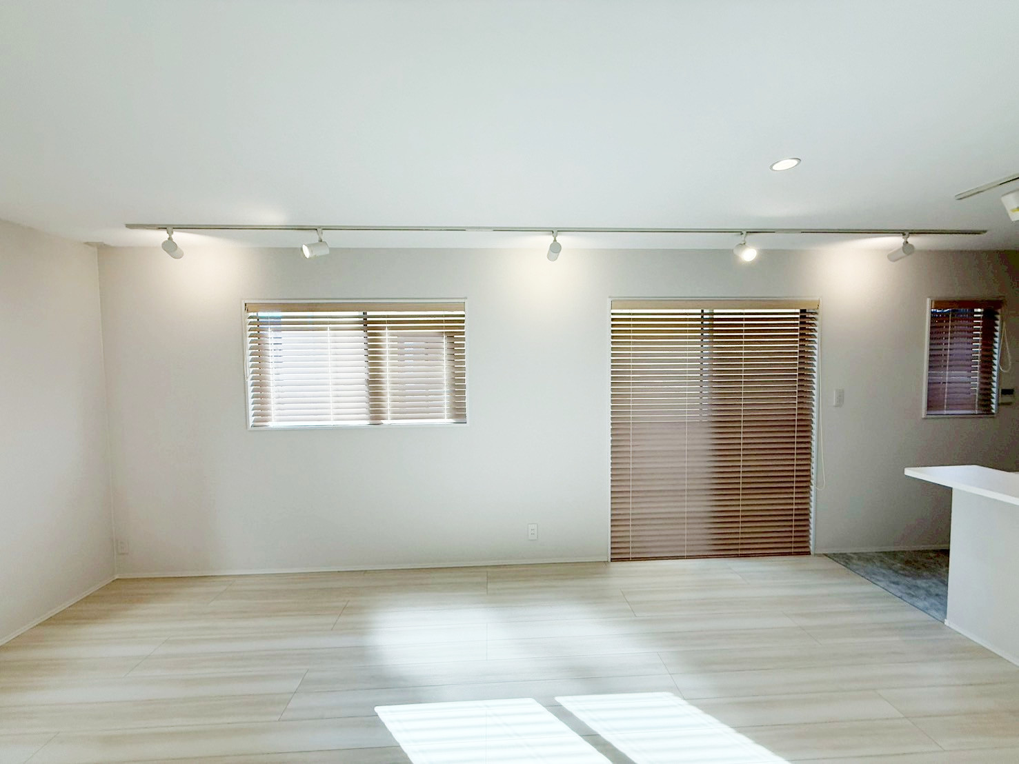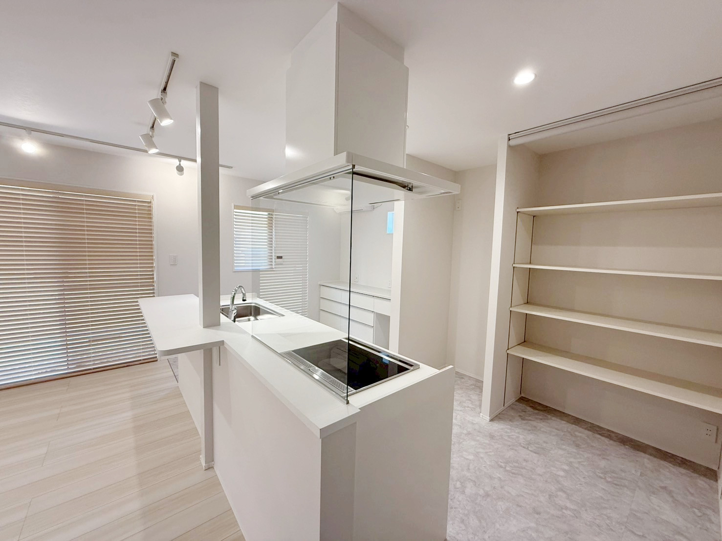 ・壁・天井・建具を白で統一し、床には明るい木目を採用。空間全体を広く、明るく見せています。