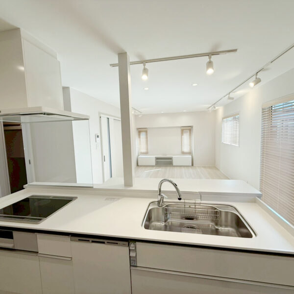 ・すっきり対面キッチン。視線が抜ける開放的なレイアウトで、リビングとの一体感を高めました。